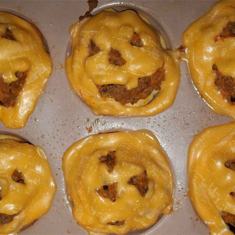 - Step 4:Cut the 10 slices of American cheese into 3-inch circles, and cut jack-o'-lantern faces into the circles with a sharp paring knife. Chop remnants of cheese, and mix into the meat mixture. Fill the biscuit cups with meat mixture, and place a cheese face on top of each.